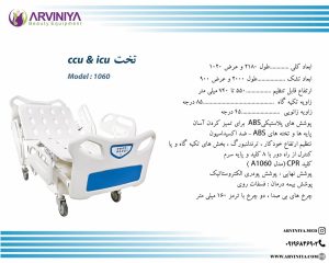 مشخصات تخت icu و ccu مدل 1060: ابعاد کلی تخت عبارت است از: طول 2180 و عرض 1020 میلی متر ابعاد تشک: طول 2000 در عرض 9000 میلی متر ارتفاع قابل تنظیم: 550 تا 740 میلی متر زاویه تکیه گاه 85 درجه زاویه زانویی 45 درجه پوشش های پلاستیکی ABS برای تمیز کردن آسان پایه […]